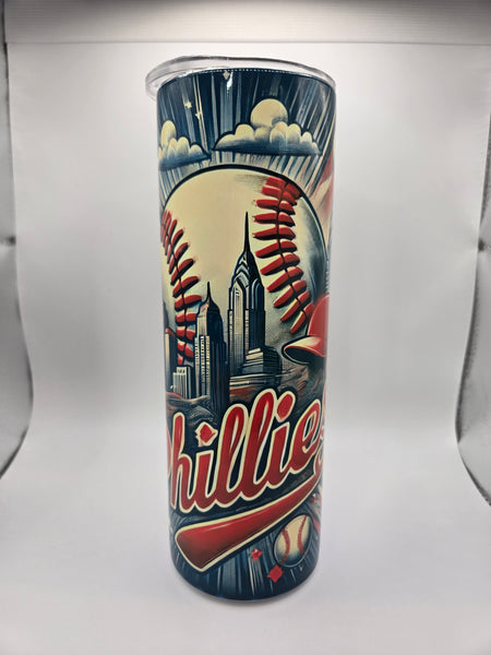 20oz skinny stainless steel double wall insulated tumbler. Great for both hot and cold drinks. Comes with sliding lid, straw, rubber bottom in a box. Made in Pennsylvania