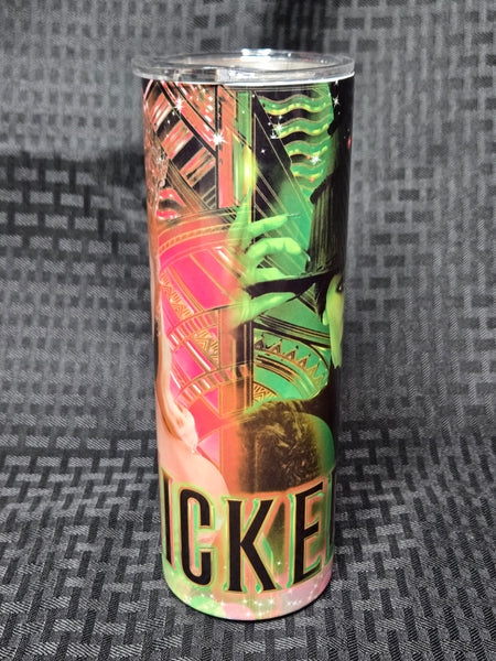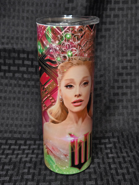 A stunning 20oz skinny tumbler featuring a vibrant fantasy-inspired design with a glamorous pink good-witch aesthetic on one side and a bold green mystical witch on the other. Bright colors, magical details, and a dramatic themed backdrop make this cup perfect for fans of enchanted stories and mystical worlds. Includes a clear lid and straw.